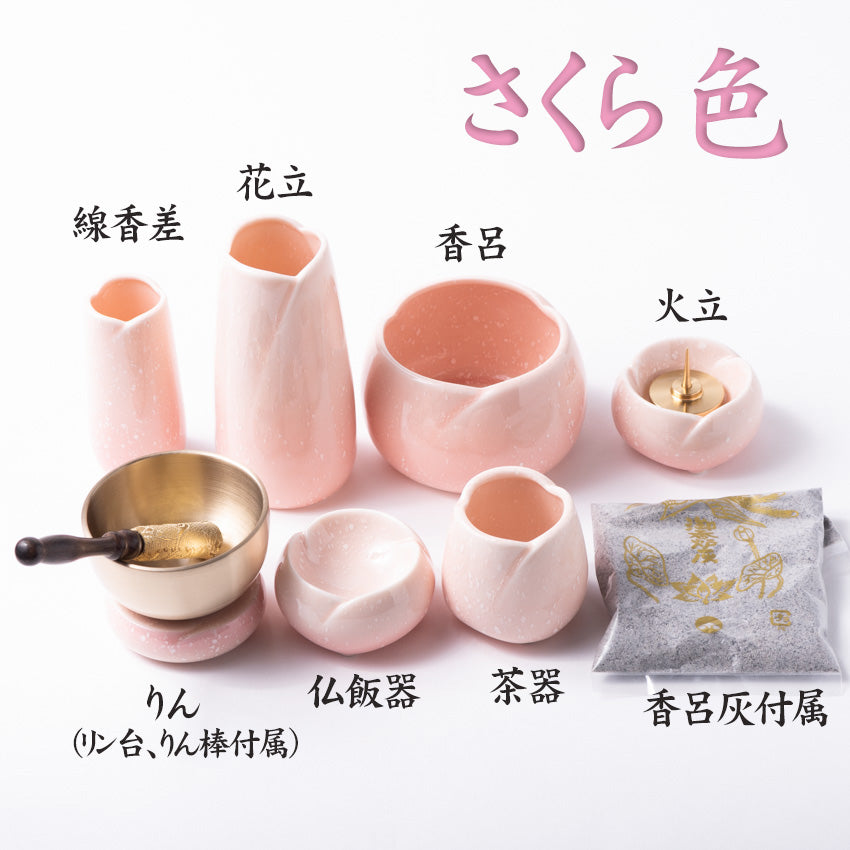 | やさしい色合いと丸みのある形の 仏具セット 陶器仏具の新シリーズ 柔らかいフォルム 花びらを思わせる可憐な仏具 |